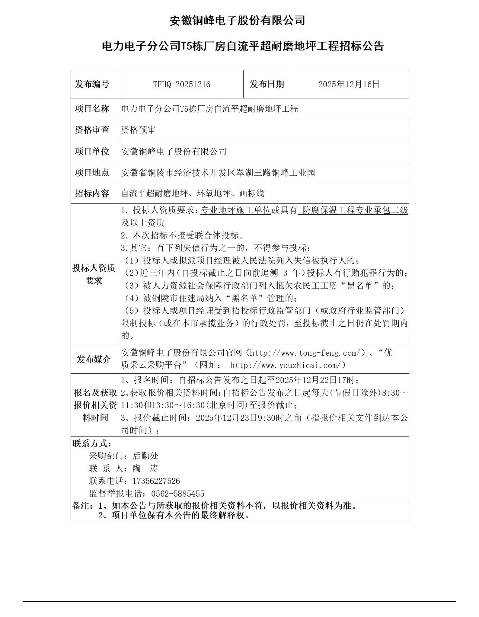 01安徽銅峰電子股份有限公司 (電力電子分公司T5棟廠房自流平超耐磨地坪工程 招標公告)_01